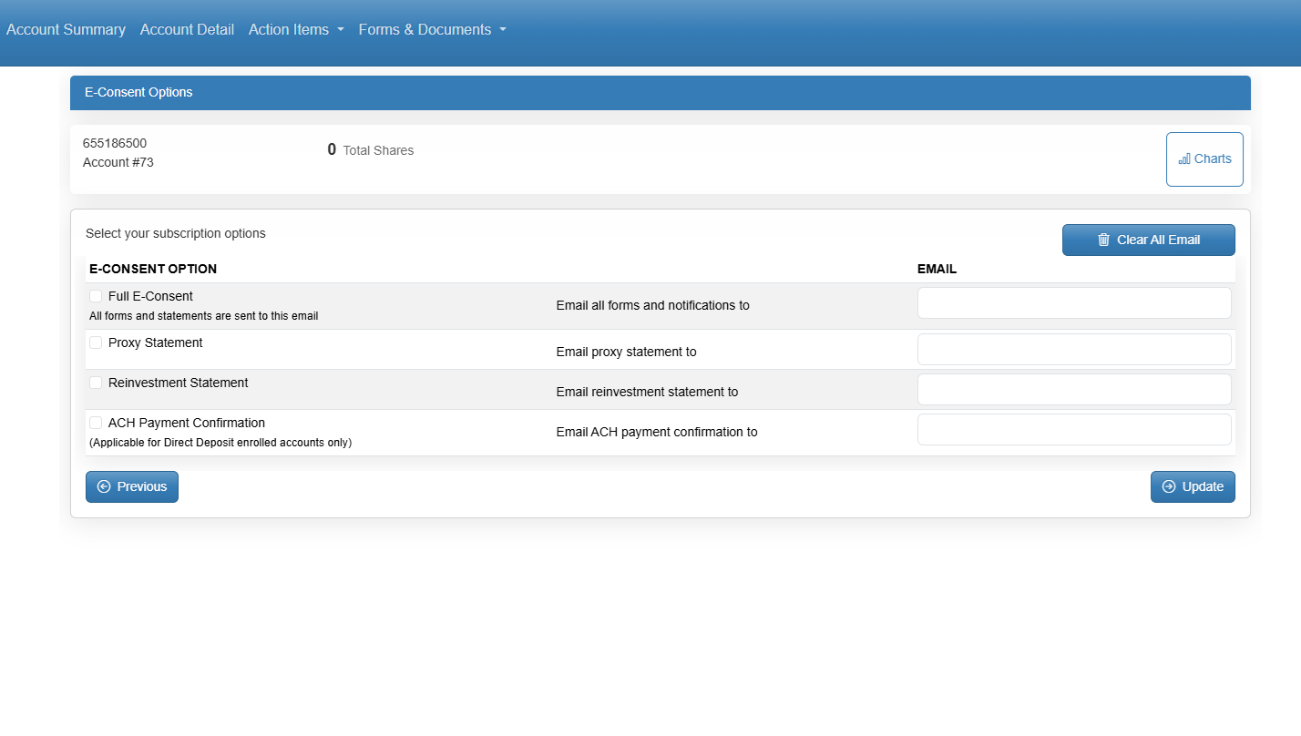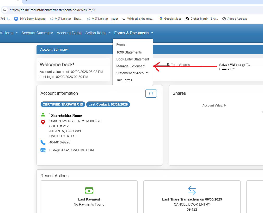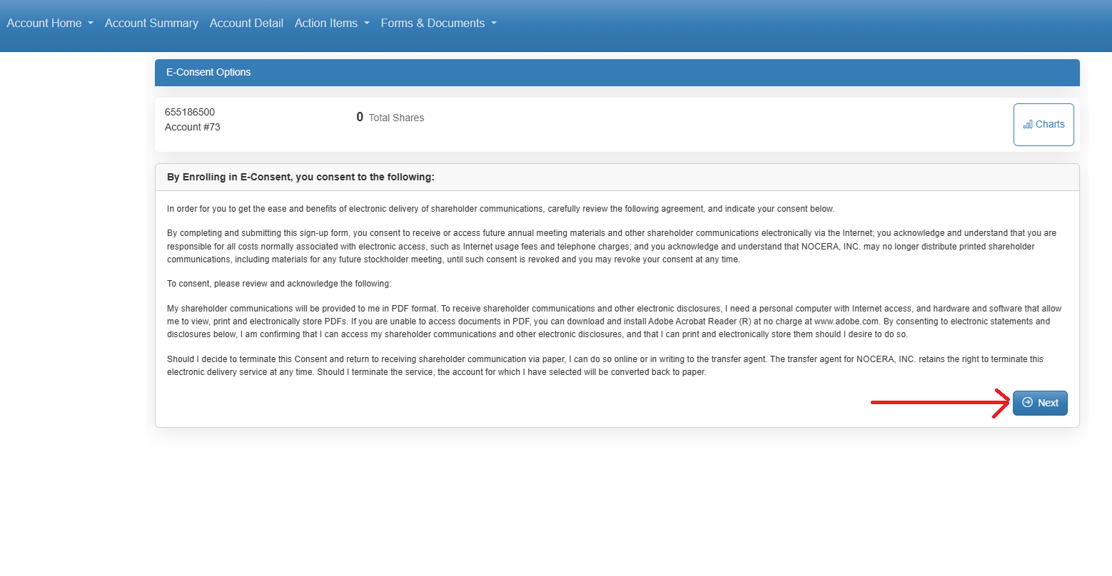 Once you have logged into our online portal, the 1st thing to do is select the class of securities you would like to update. Then please select "Forms and Documents" and then select "Manage E-Consent".